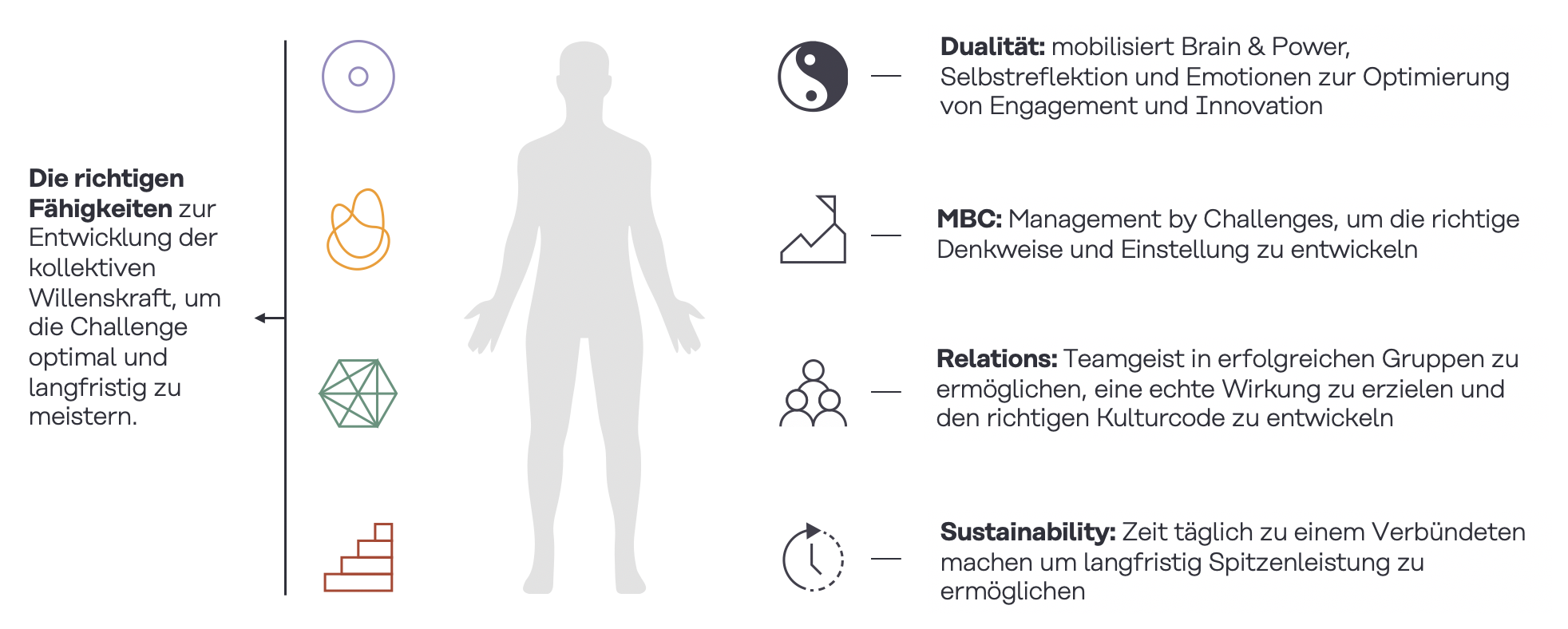 Als Experten der menschlichen Dimension, unterstützen wir Unternehmen in ihrem Veränderungsvorhaben. Mit Fokus auf die konsequente Umsetzung der Strategie, bringen wir die unternehmerische Challenge der Organisation mit den persönlichen Challenges der Führungskräfte und Mitarbeiter in Einklang. Wir tragen zum Erfolg von Transformationsprozessen bei, indem Methoden, Programme und Aktivierungen reibungsloser in den Arbeitsalltag überführt werden. Wir unterstützen in der strategischen Planung und operativen Umsetzung die Transformation und bieten Beratungs- und Trainingsleistungen, welche energetisierend und zielführend zugleich wirken.